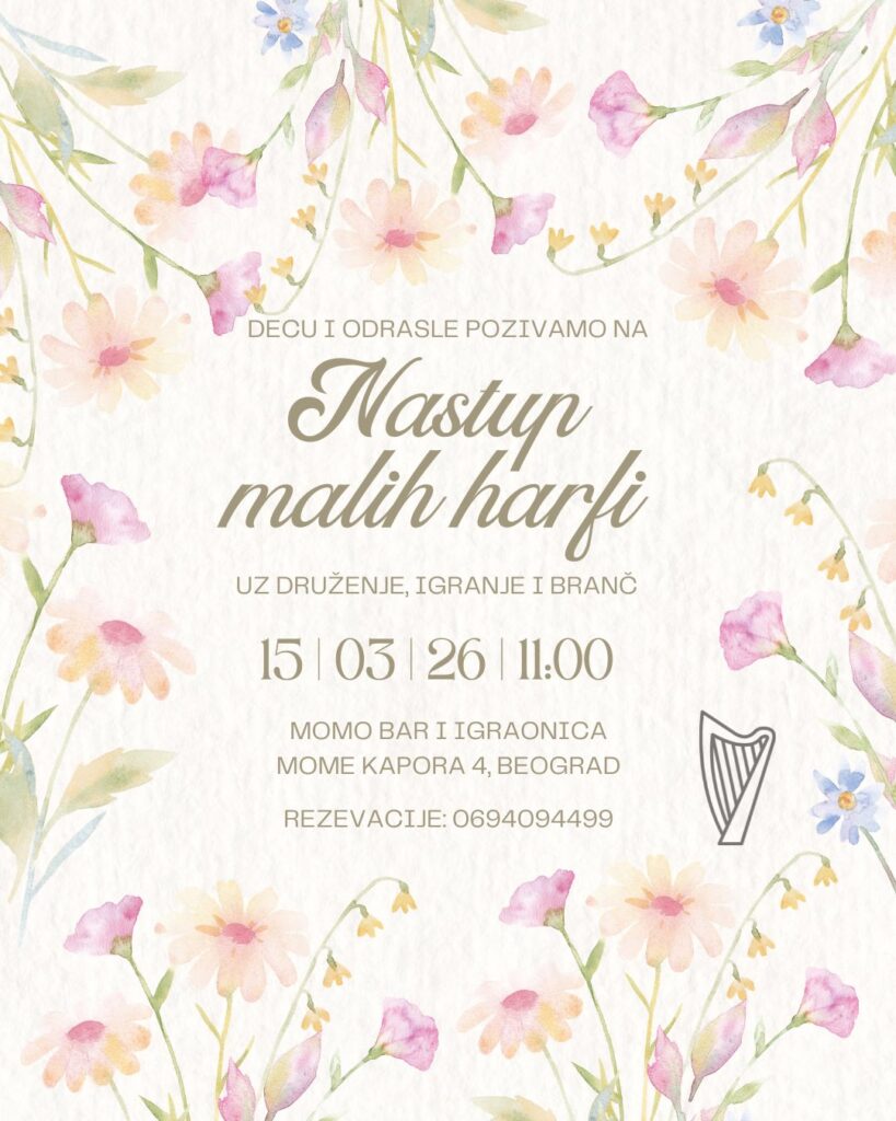 U nedelju 15. marta 2026. godine, u toplom i prijatnom ambijentu Momo bara održan je nastup polaznika harfe svih uzrasta. Publika je imala priliku da uživa u nežnim i umirujućim zvucima malih Harfinna i Eufonia harfi, kroz raznovrstan i pažljivo pripremljen program učenika „Harpomania“ koncepta. Događaj je protekao u opuštenoj, jutarnjoj atmosferi uz muziku i branč, gde su se druženje i umetnost prirodno spojili. Posebnu radost donela je i igraonica u okviru prostora, u kojoj su najmlađi uživali dok su odrasli upijali muziku i ambijent. Hvala svima koji su bili deo ovog lepog muzičkog susreta!
